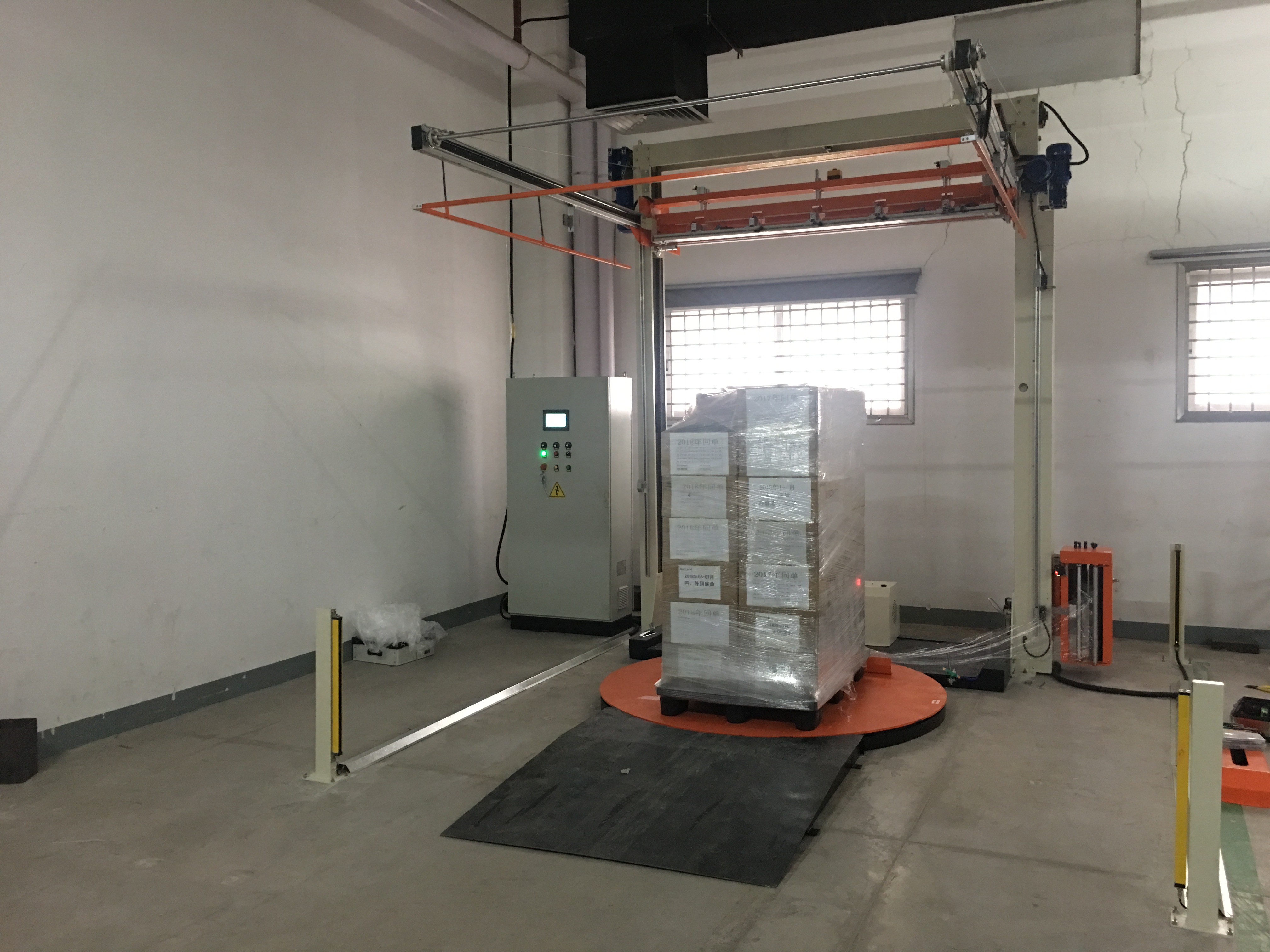 全自动遥控缠绕覆顶包装机装有自动上、断、粘膜机构及遥控装置,操作人员可于叉车上或远程控制自动运行,实现垛型的四周缠膜及顶部覆膜。轻松实现防尘、防潮及美观可靠的托盘包装,提高包装档次。