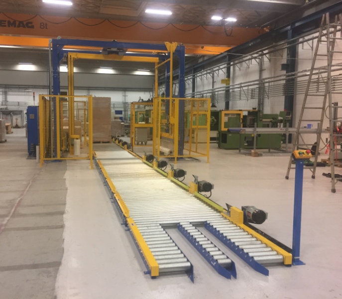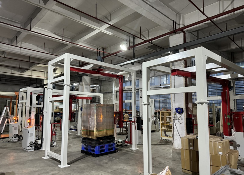 主要适用于生产量大、物流自动化较高的现代化企业。可根据不同的产品和现场的实际要求,定制不同的包装系统,自动完成货物的感测、缠膜、顶部覆膜、输送等全过程,输送机构可采用滚筒、链板、链条等不同的方式。自动薄膜缠绕包装实现防尘、防潮及美观可靠的托盘外观,提高包装档次。此类产品已在化工、电子、食品、饮料、造纸等行业自动包装线中得到广泛应用。最大的特点是:货物不旋转,机器旋转,保证易倒的货物不错位等;